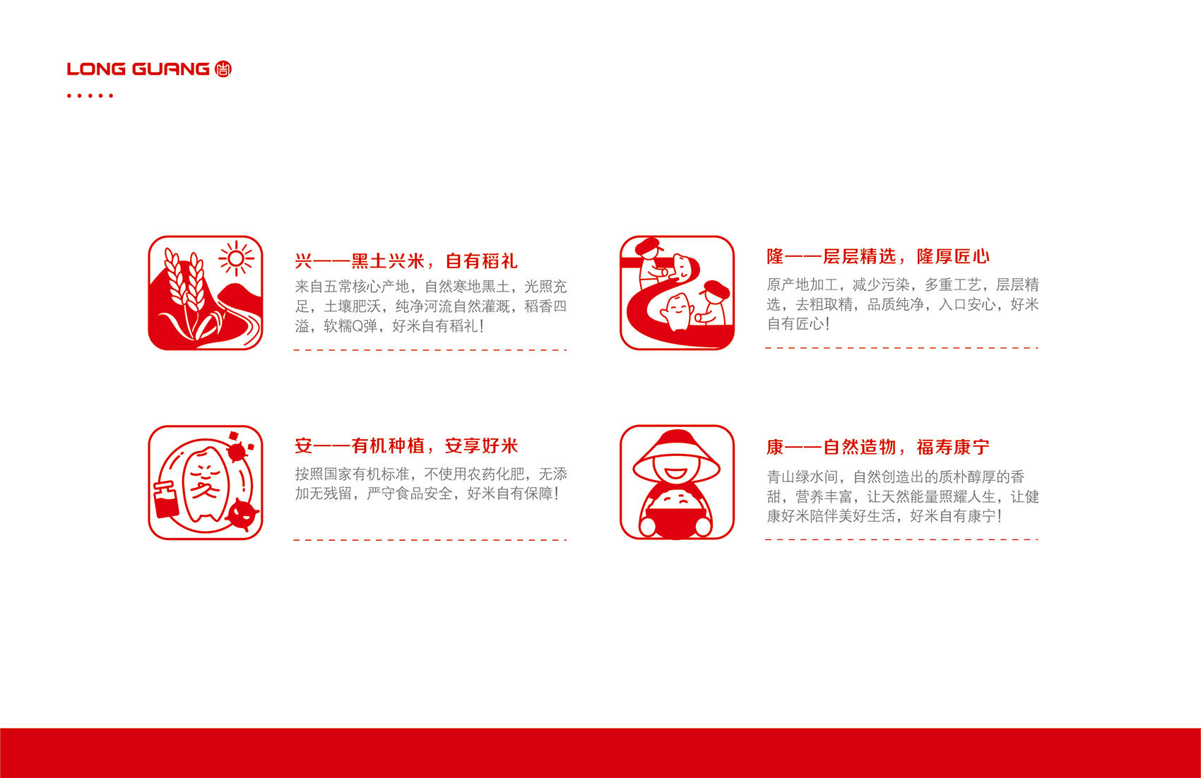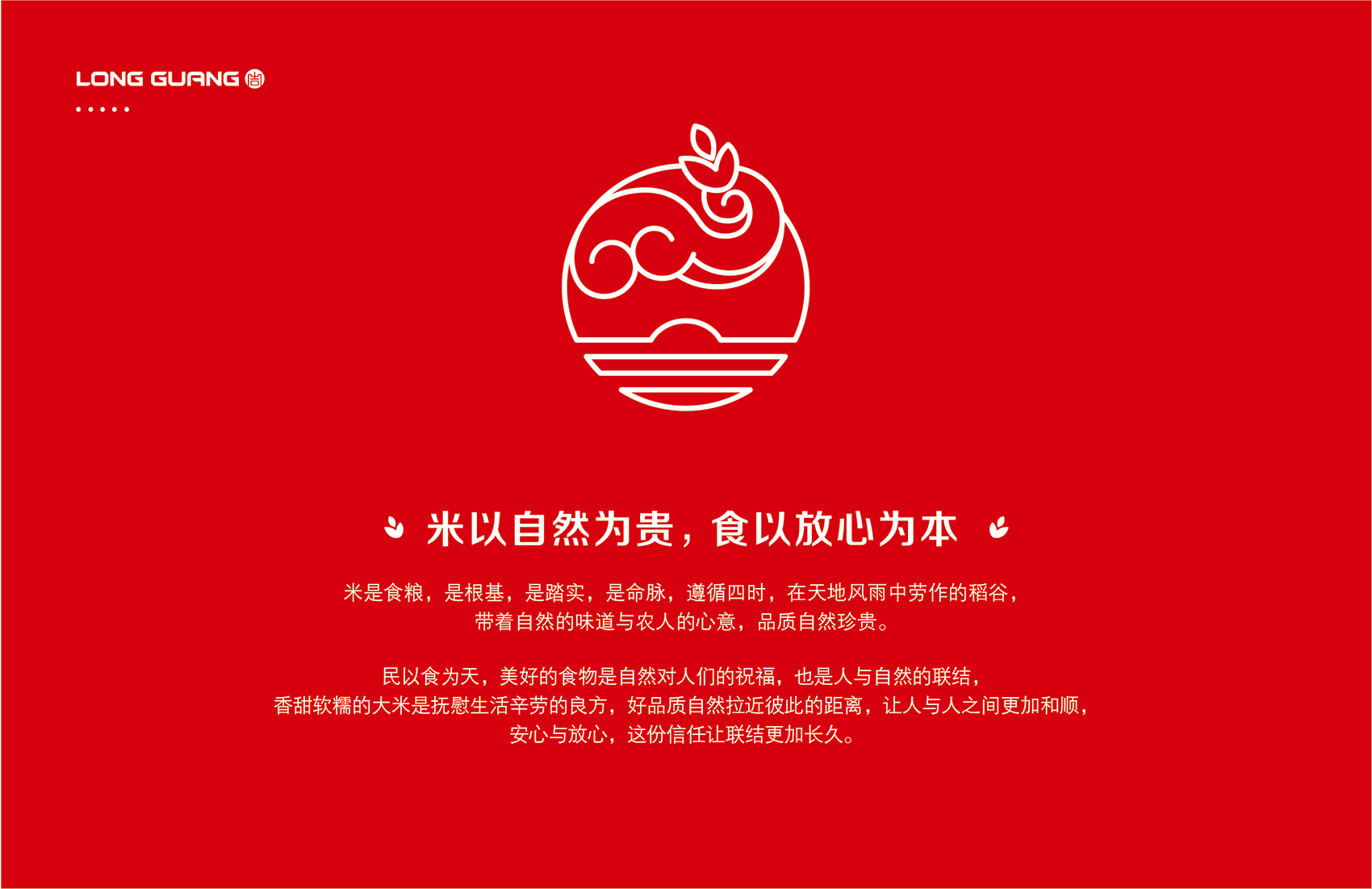 品牌文化從隆光=放心為出發(fā)點(diǎn),以品牌定位為核心,逐層遞進(jìn)不斷詮釋隆光大米=放心糧的品牌占位,總結(jié)出吃隆光,放心糧的slogan,并歸納出“興隆光景、吉祥如意、全心全意、平安健康”四個(gè)品牌核心價(jià)值,將企業(yè)的匠心精神與產(chǎn)品品質(zhì)進(jìn)行了梳理論證,全方位闡釋隆光大米的高品質(zhì),打造與同類市場相區(qū)隔的品牌印象。