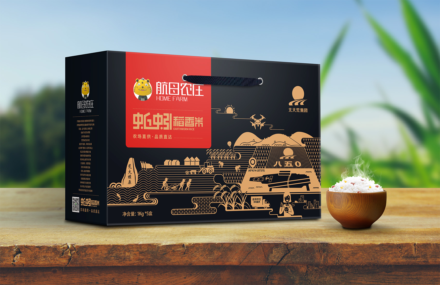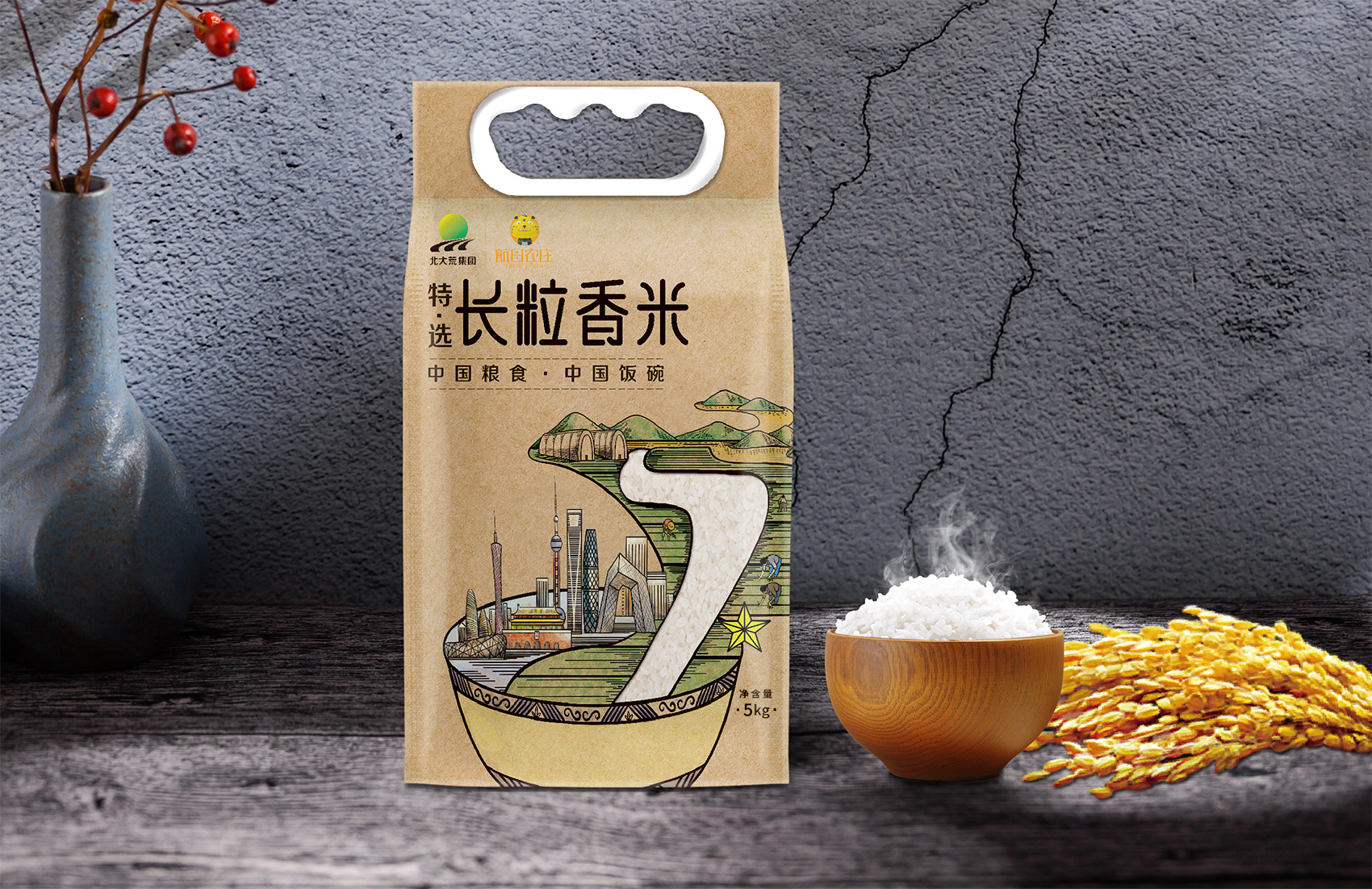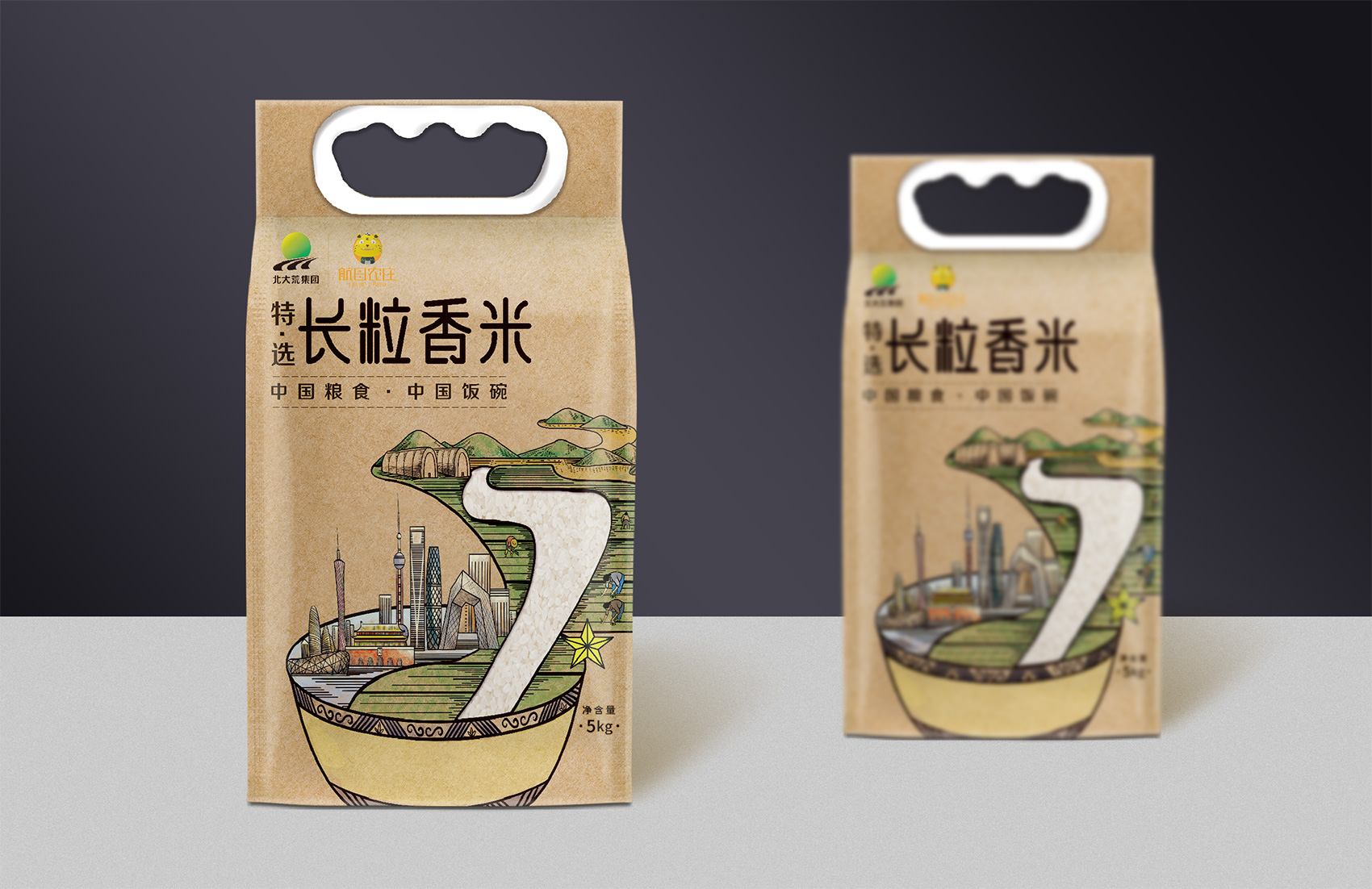 長粒香種植區(qū)位于七星農(nóng)場,在習(xí)近平總書記考察后發(fā)表了著名的中國飯碗中國糧的講話,“北大荒為中國人真正解決溫飽問題發(fā)揮了大作用,我們一定要保護好黑土地,保護好中國飯碗。中國人要把飯碗端在自己手里,而且要裝自己的糧食?!崩_策采用類版畫風格的插畫來表現(xiàn)從農(nóng)場直接到飯碗中的品牌核心價值,優(yōu)質(zhì)的綠水青山自然環(huán)境之下生產(chǎn)出高品質(zhì)好滋味的長粒香,中間的鏤空部分既象征著產(chǎn)品的產(chǎn)地——七星農(nóng)場,也象征著運送產(chǎn)品的廣闊道路,形成令人記憶深刻的超級符號;在碗中的地標性建筑物代表全國各地,寓意企業(yè)寬廣美好的未來;整體包材采用環(huán)保牛皮紙,在提升了質(zhì)感與手感的同時,也能在同質(zhì)化的包裝中脫穎而出。