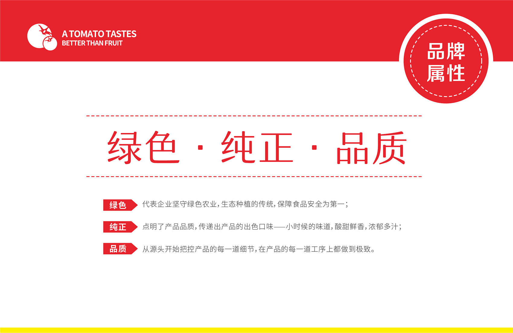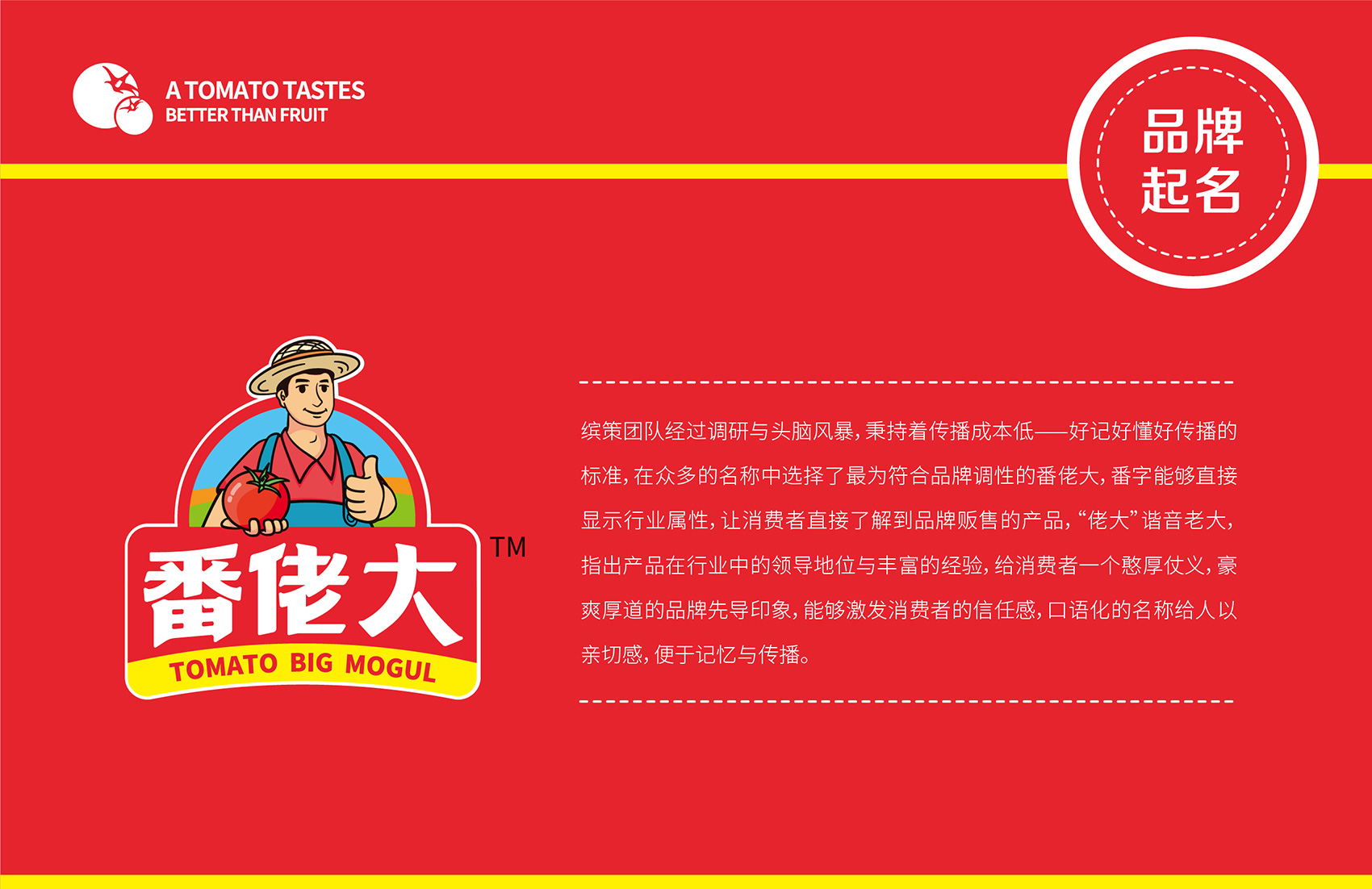 針對(duì)番佬大綠色生態(tài)番茄的定位,繽策提煉出純正為核心概念的文化體系,從品牌DNA開(kāi)始不斷貫穿番佬大番茄的美好滋味,針對(duì)目標(biāo)消費(fèi)人群的審美偏好,以質(zhì)樸平實(shí)的語(yǔ)言風(fēng)格構(gòu)建出綠色生態(tài)番茄的立體體系,slogan為“比水果還好吃的番茄”,不僅針對(duì)消費(fèi)者做出品質(zhì)的承諾與保證,讓消費(fèi)者能清楚明了的了解番佬大值得信賴(lài)的原因,更是對(duì)企業(yè)內(nèi)部的要求,指明了企業(yè)未來(lái)的發(fā)展方向,持續(xù)不斷的為百姓提供綠色健康,安全美味的品質(zhì)番茄。