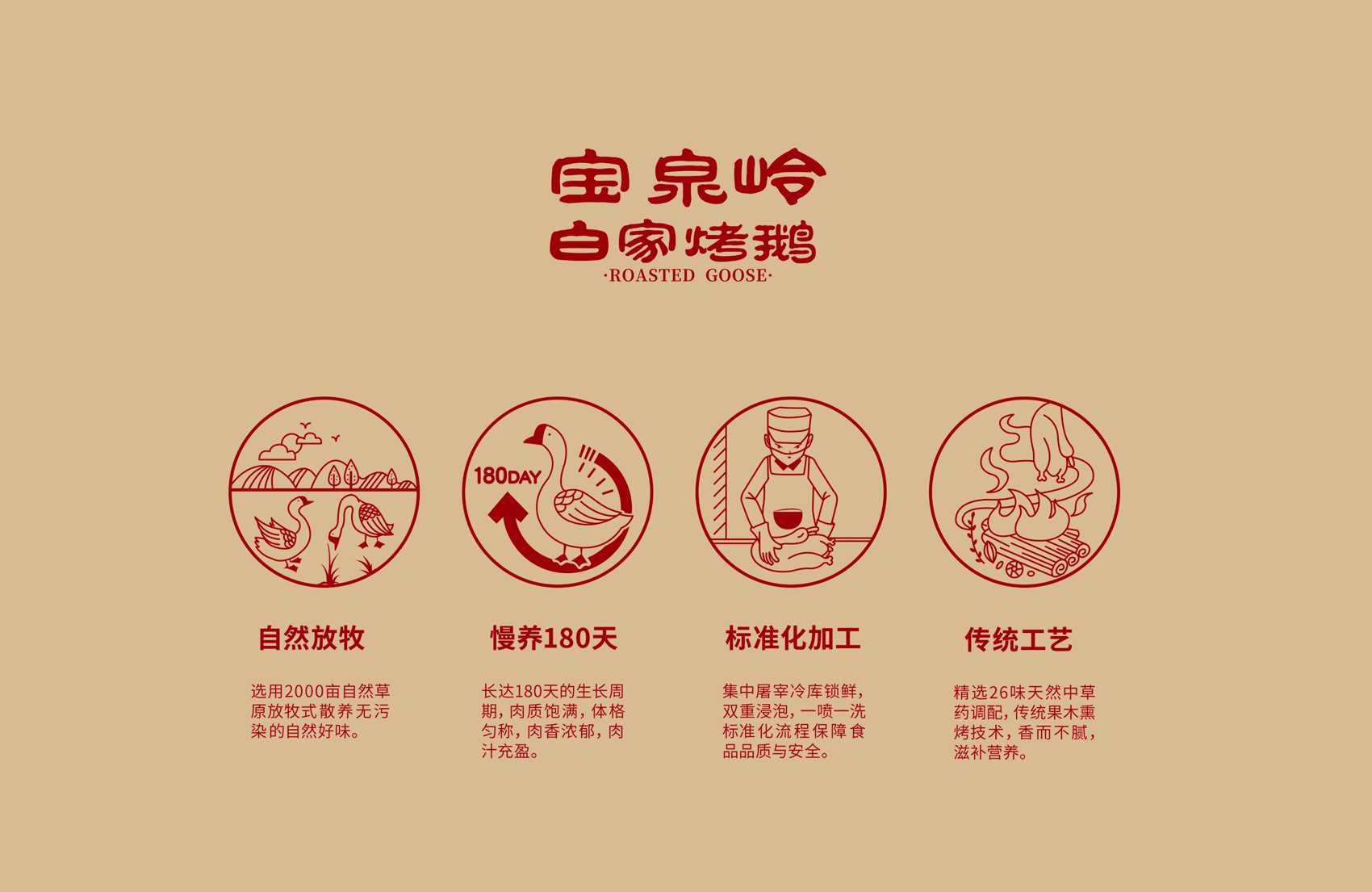 以真實形象示人代表敢為產(chǎn)品與品牌負責,白家烤鵝的LOGO選擇以創(chuàng)始人的照片進行注冊本身就代表了一種承諾,結合知青群體的審美,繽策將“寶泉嶺白家烤鵝”與標志組合成一個喜慶的中式春聯(lián)的吉祥圖案,通過中式春聯(lián)的傳統(tǒng)符號將寶泉嶺白家烤鵝植入到消費者心智,形成喜慶紅火,佳節(jié)伴手禮的品牌印象;字體使用原創(chuàng)設計字體,參考傳統(tǒng)隸書的書法風格,方勁古拙,厚重可靠,其中的“嶺”字右半部分經(jīng)過整合,形似“合”字代表了品牌對于消費者的美好祝愿與對于烤鵝事業(yè)的不懈努力的目標愿景。